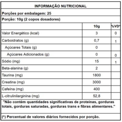 Sugestão de Uso: Consumir 1 copo dosador (5g) em 150ml de água, uma hora antes do treino, duas vezes ao dia. Não exceder a porção de 2 copos dosadores ao dia. Consumir 30ml a cada 2 horas, ou conforme orientação profissional.